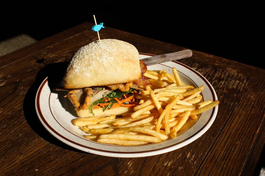 Rushed Waters Smoked Trout, Crispy Bacon, Carrots, Cucumber, Jalapeno, Chili Crisp Mayo on a Ciabatta Roll