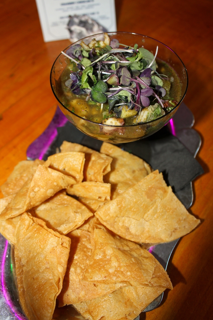 Octopus, Aguachile Negro, Cilantro, Cucumber, Pickled Red Onion, Chili Crisp