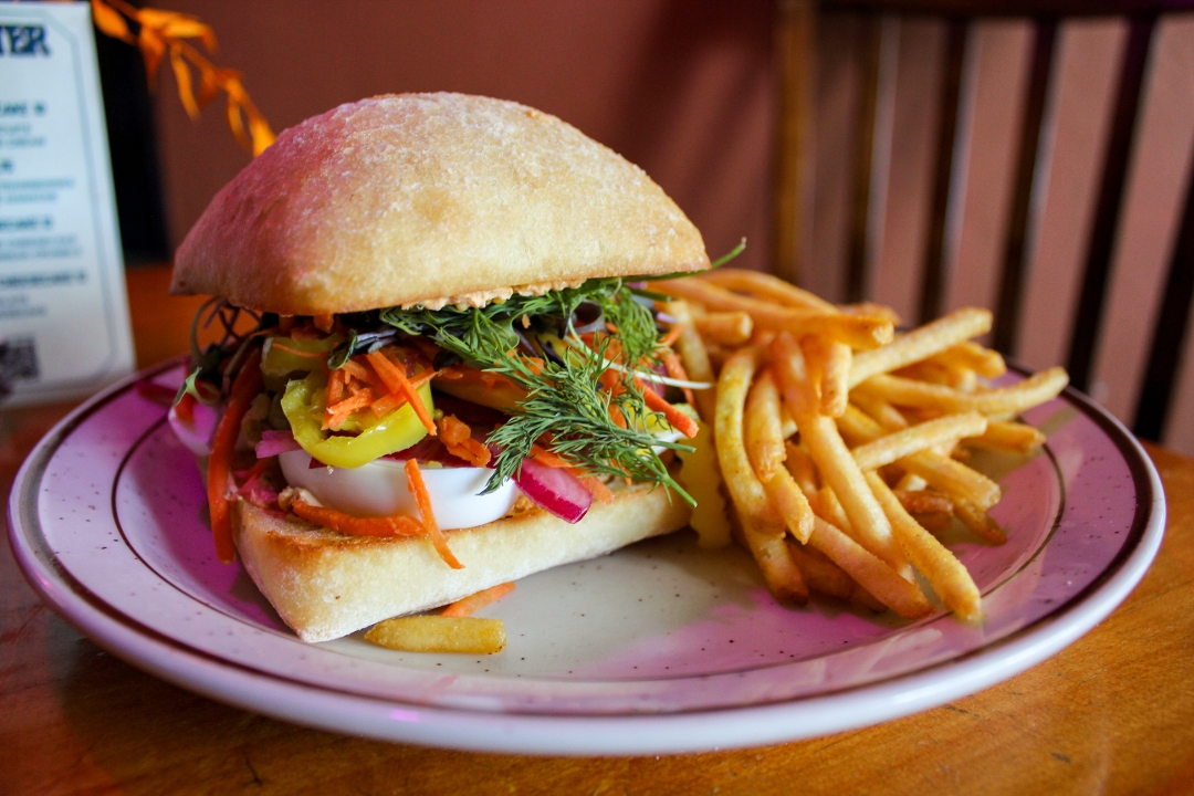 Pickled Peppers, Pickled Red Onion, Pickled Mustard Seed, Gherkins, Carrots, Micro Radish, Dill, Soft Egg, Pimento Cheese, on a Ciabatta Roll
