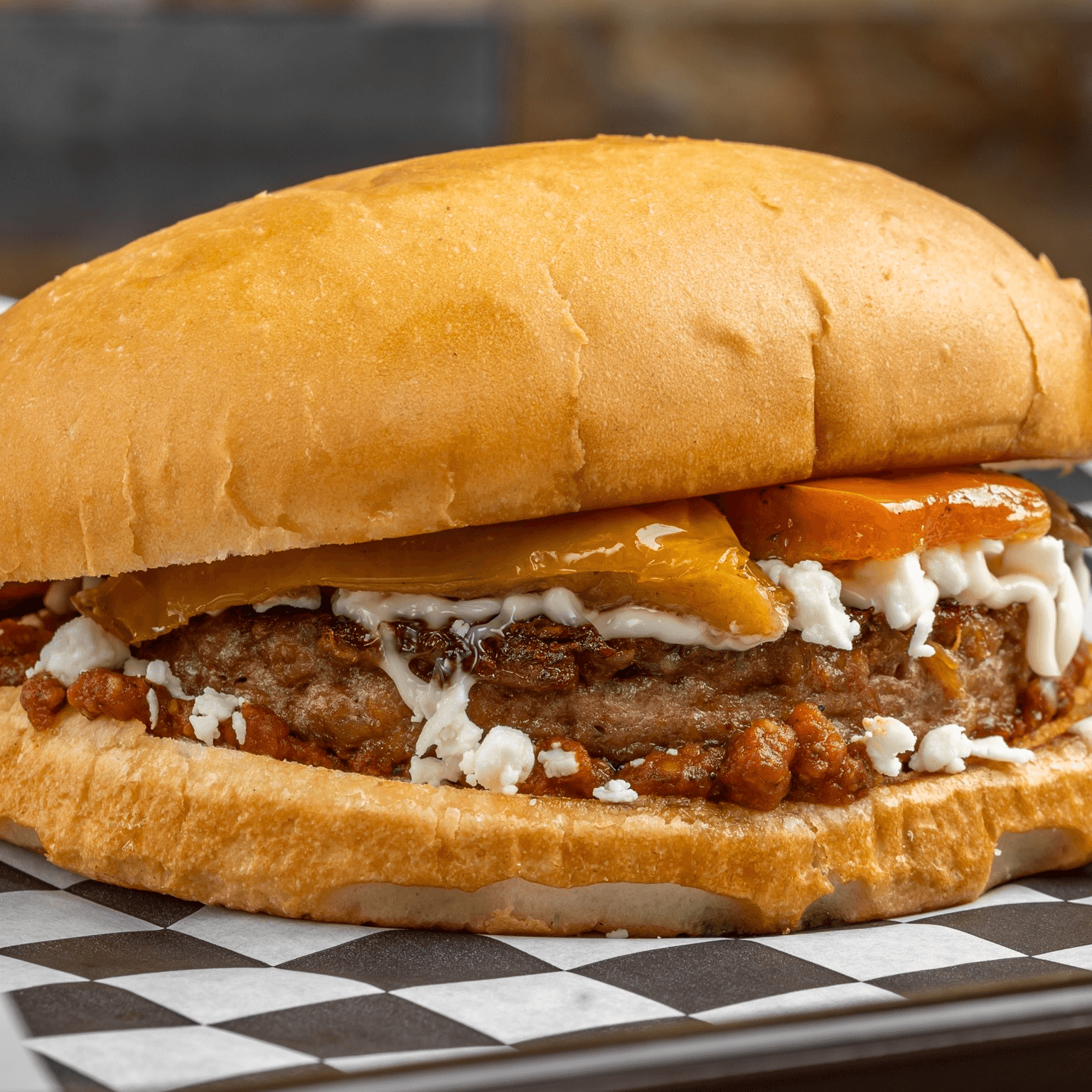 Beyond. Gourmet plant based burger patty, tomato charmoula dressing, feta cheese and grilled veggies