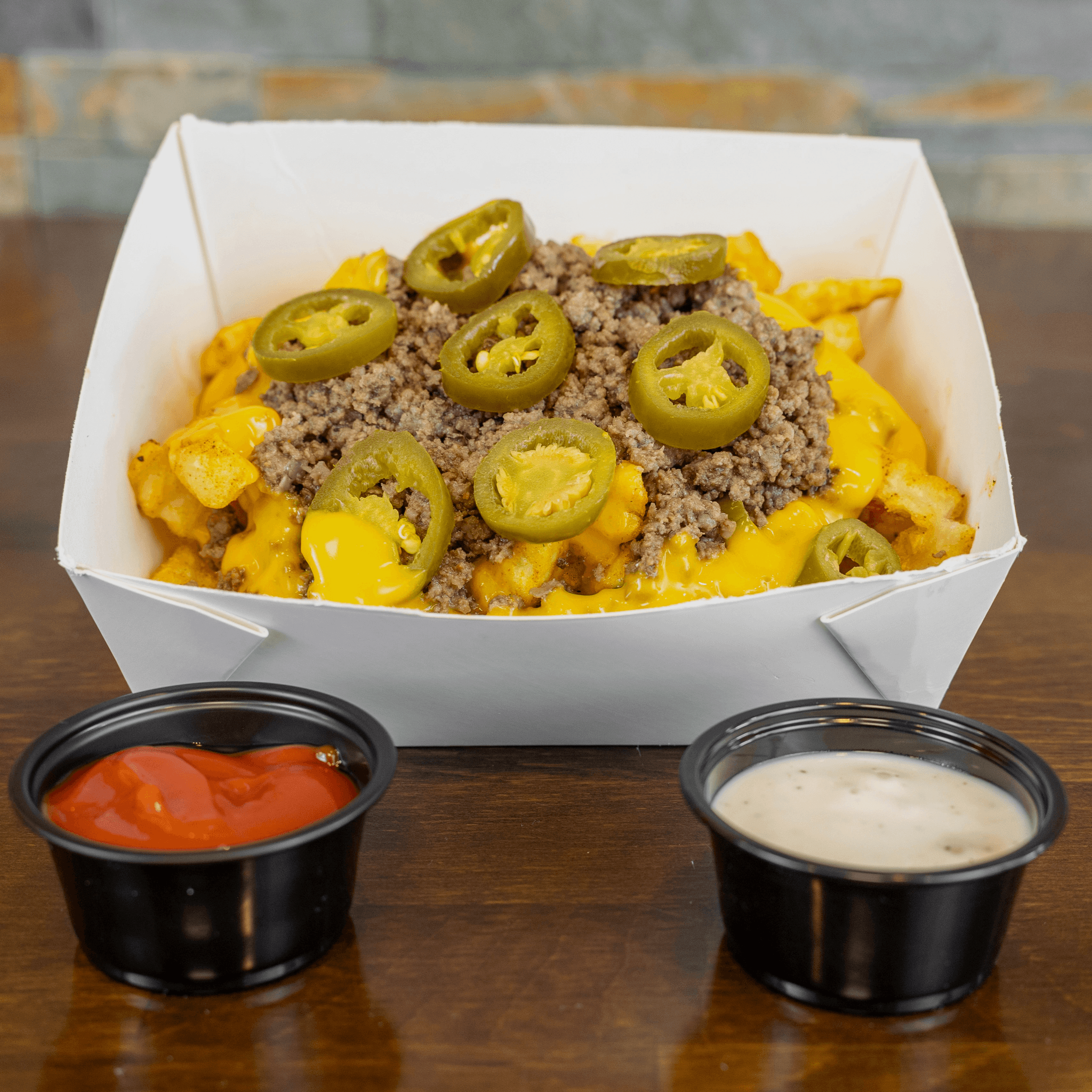Indulge in our cheesy beefy flex fries, featuring large flex fries generously loaded with melted cheddar cheese, jalapeños and ground beef