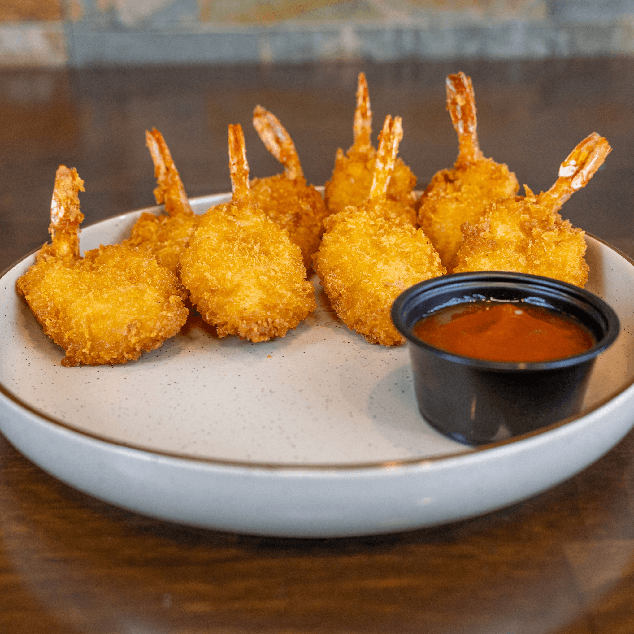 Golden fried shrimp with a crispy coating, served alongside a tangy cocktail sauce for dipping