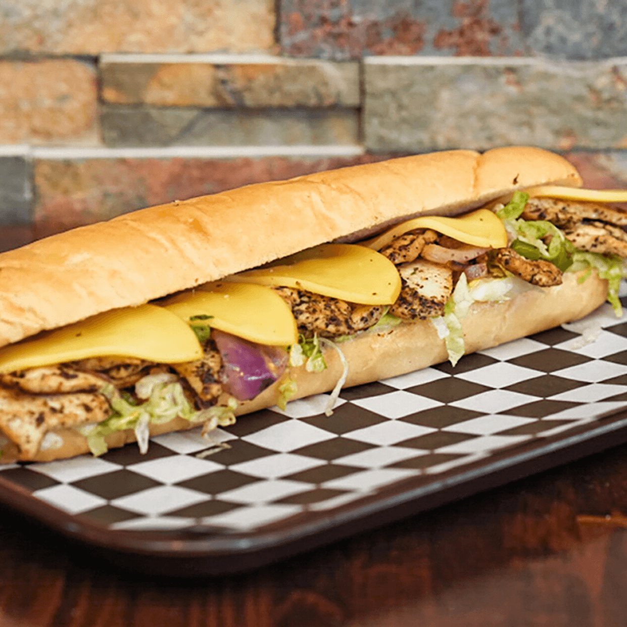 Chicken breasts marinated in garlic & herbs, caramelized onions & peppers, mayo, lettuce and smoked Gouda cheese