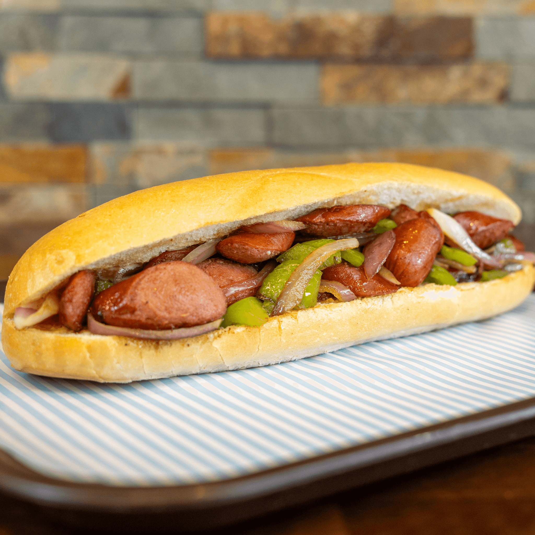 Sliced beef hot dog grilled with onions, peppers and signature dressing
