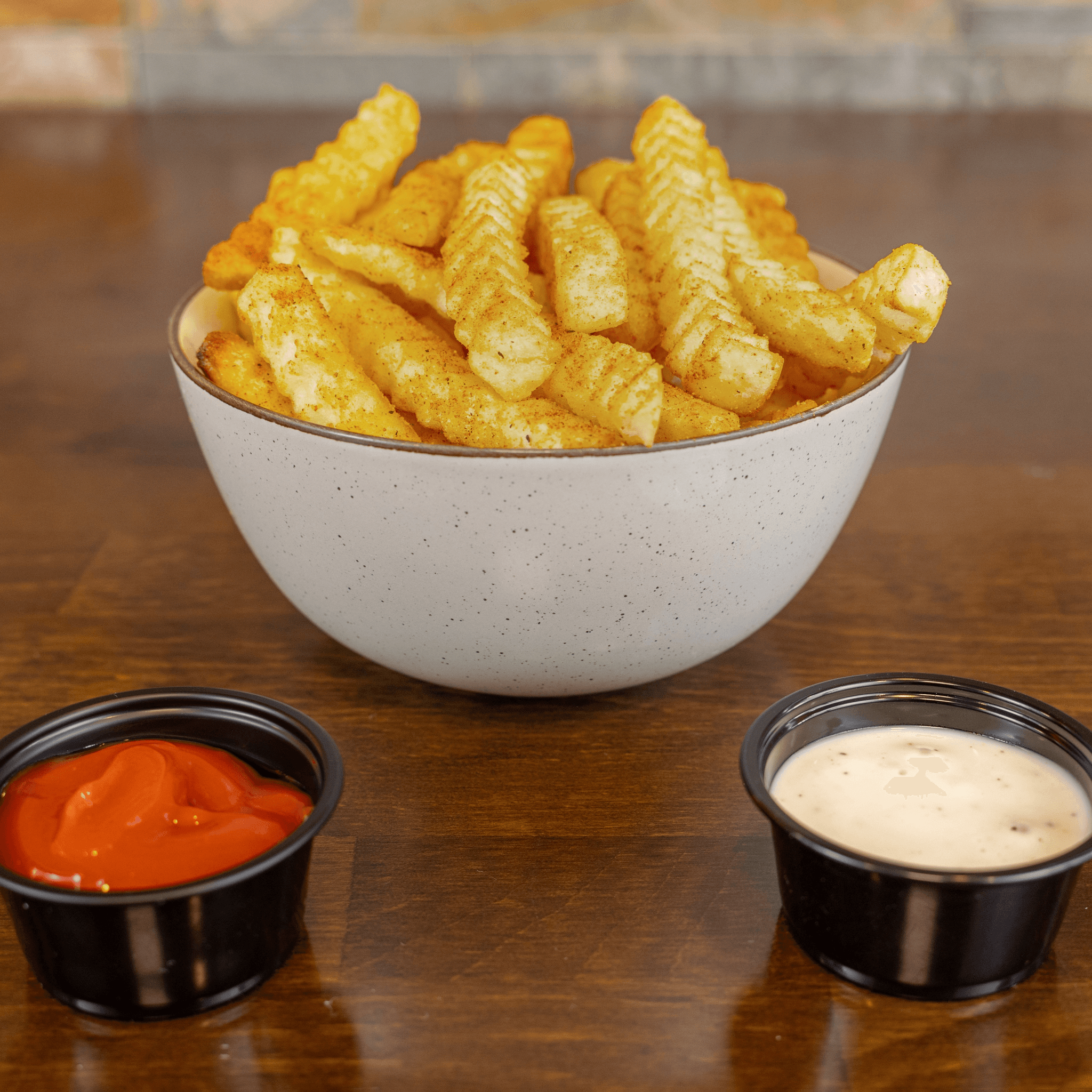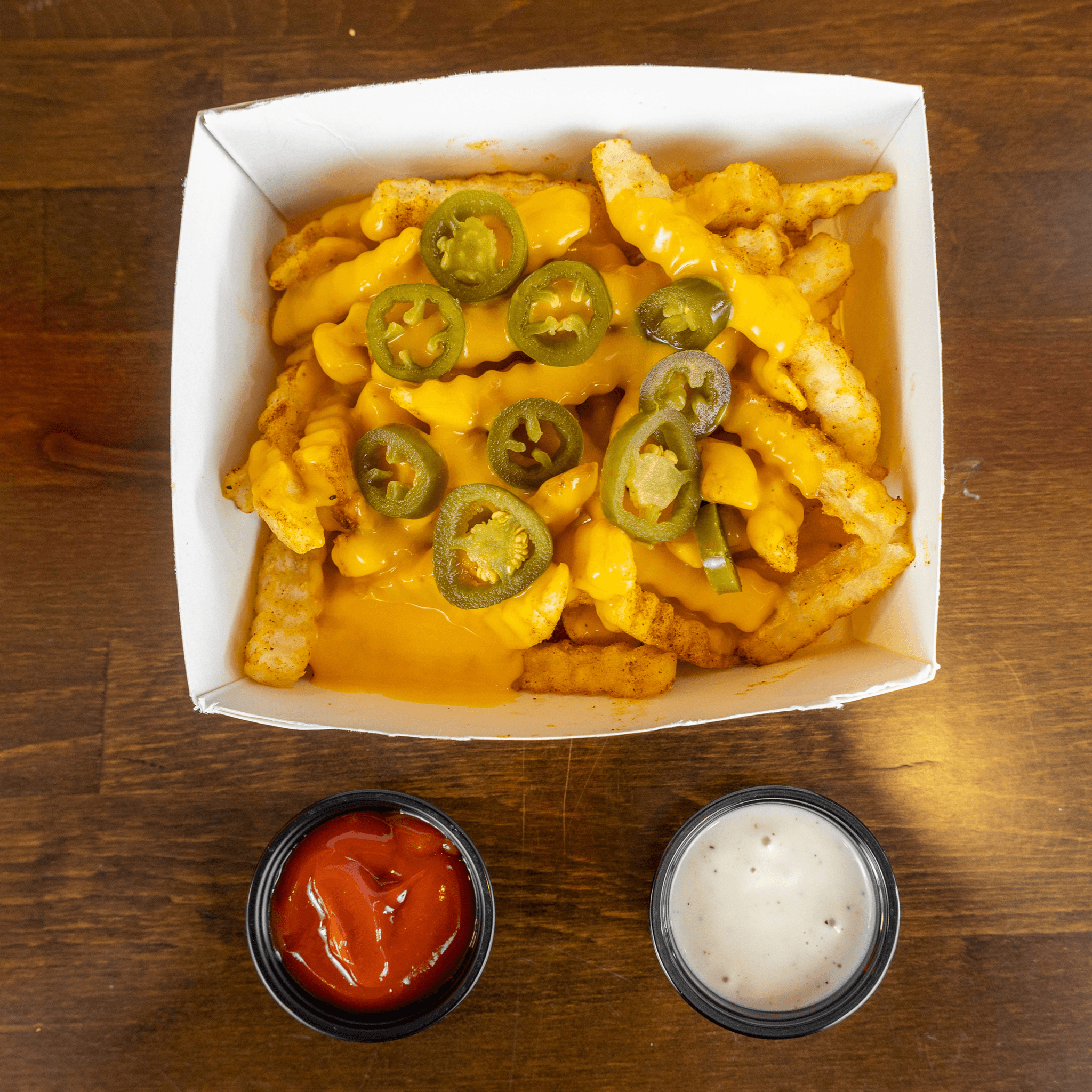Indulge in our cheesy flex fries, featuring large flex fries generously loaded with melted cheddar cheese and jalapeños