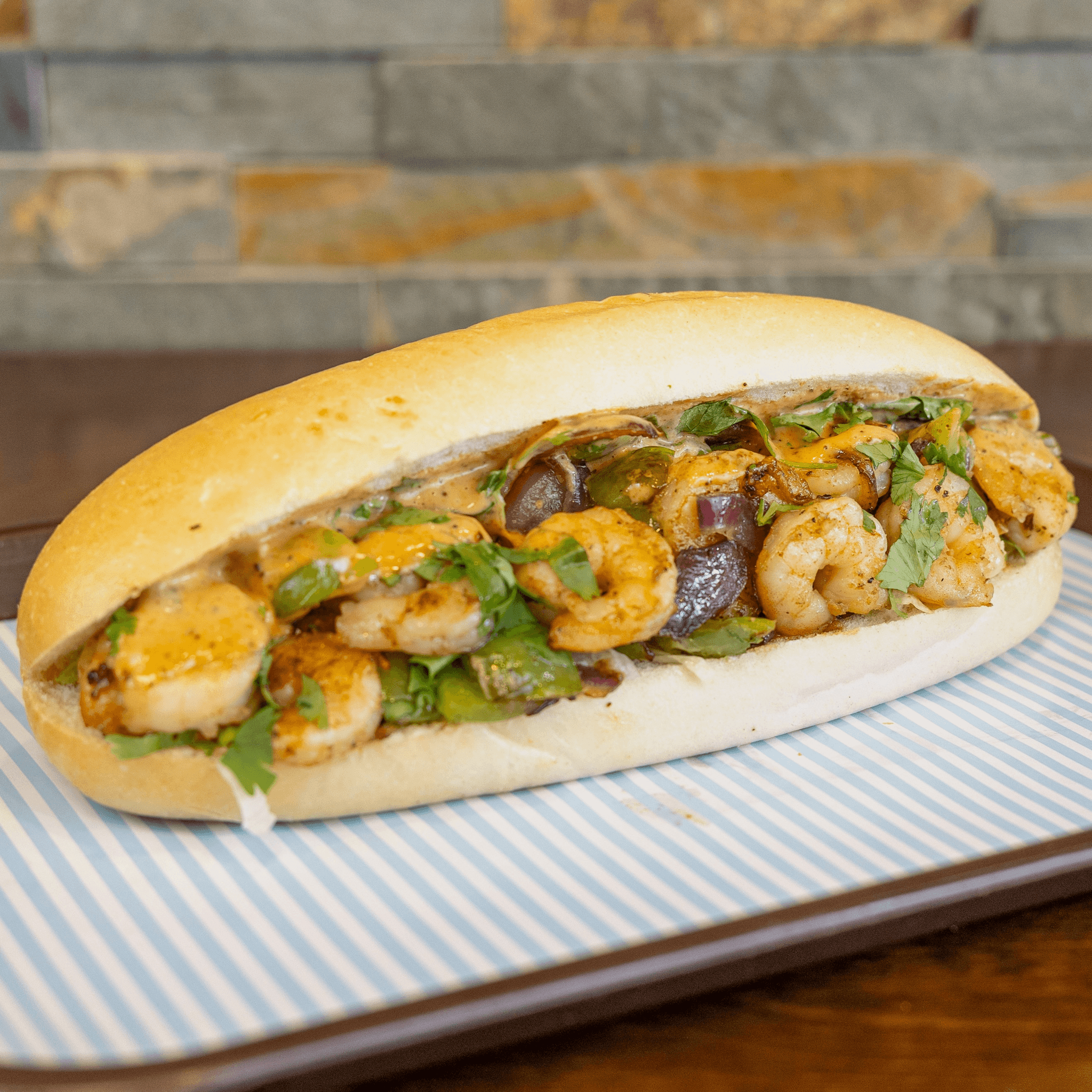 Grilled shrimp with our signature dressing, caramelized onions & peppers, cilantro and lettuce