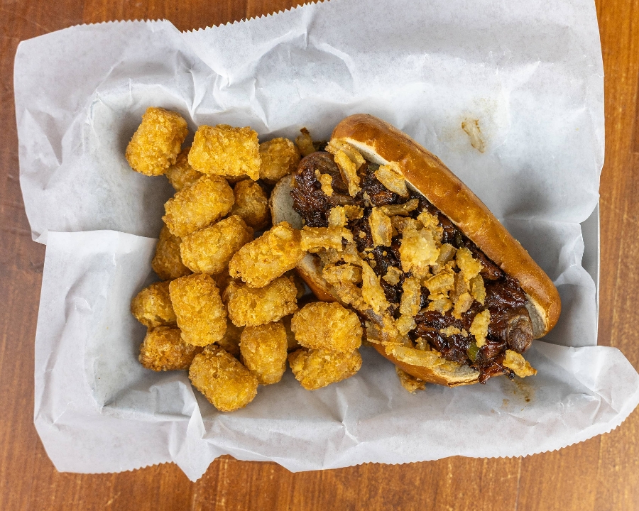 Lakefront Riverwest Stein marinated grilled brat, topped with pulled pork, jalapeno and crispy onion strings.