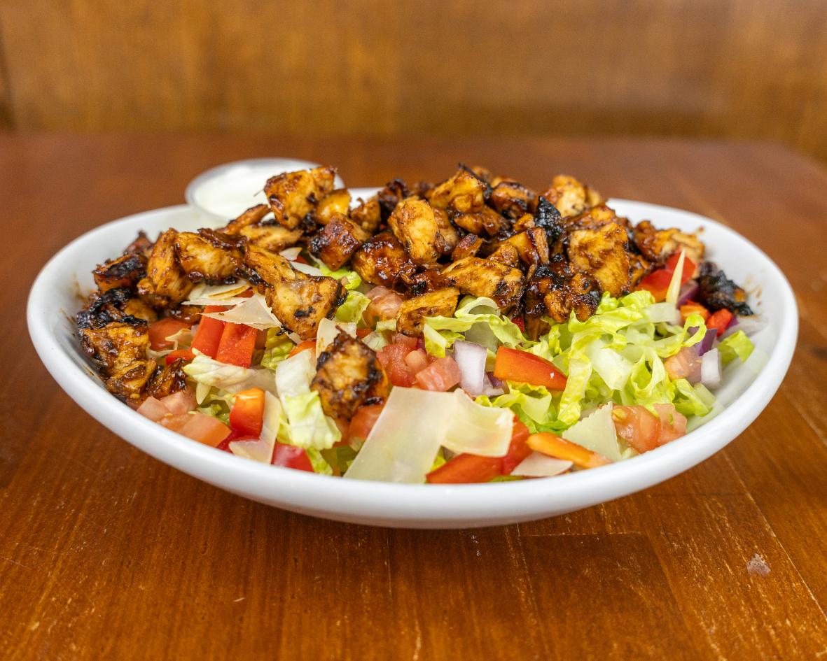 Chopped romaine, italian dressing, red peppers, red onions, tomato, Italian cheese blend and chicken tossed in BBQ sauce.