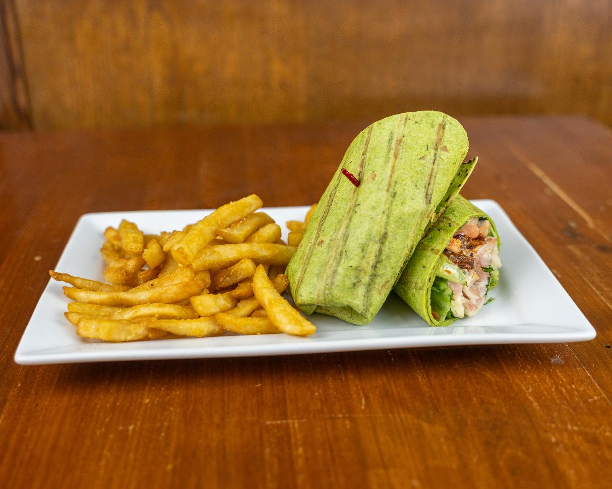 Chicken tenders tossed in hot sauce, bleu cheese dressing, lettuce, tomato, onion, carrots, chipotle jack