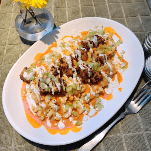 Elbow pasta (wheat or gluten free) in creamy beerline cheese sauce with tangy buffalo sauce, smoky tofu, red onion, celery bits and ranch dressing.