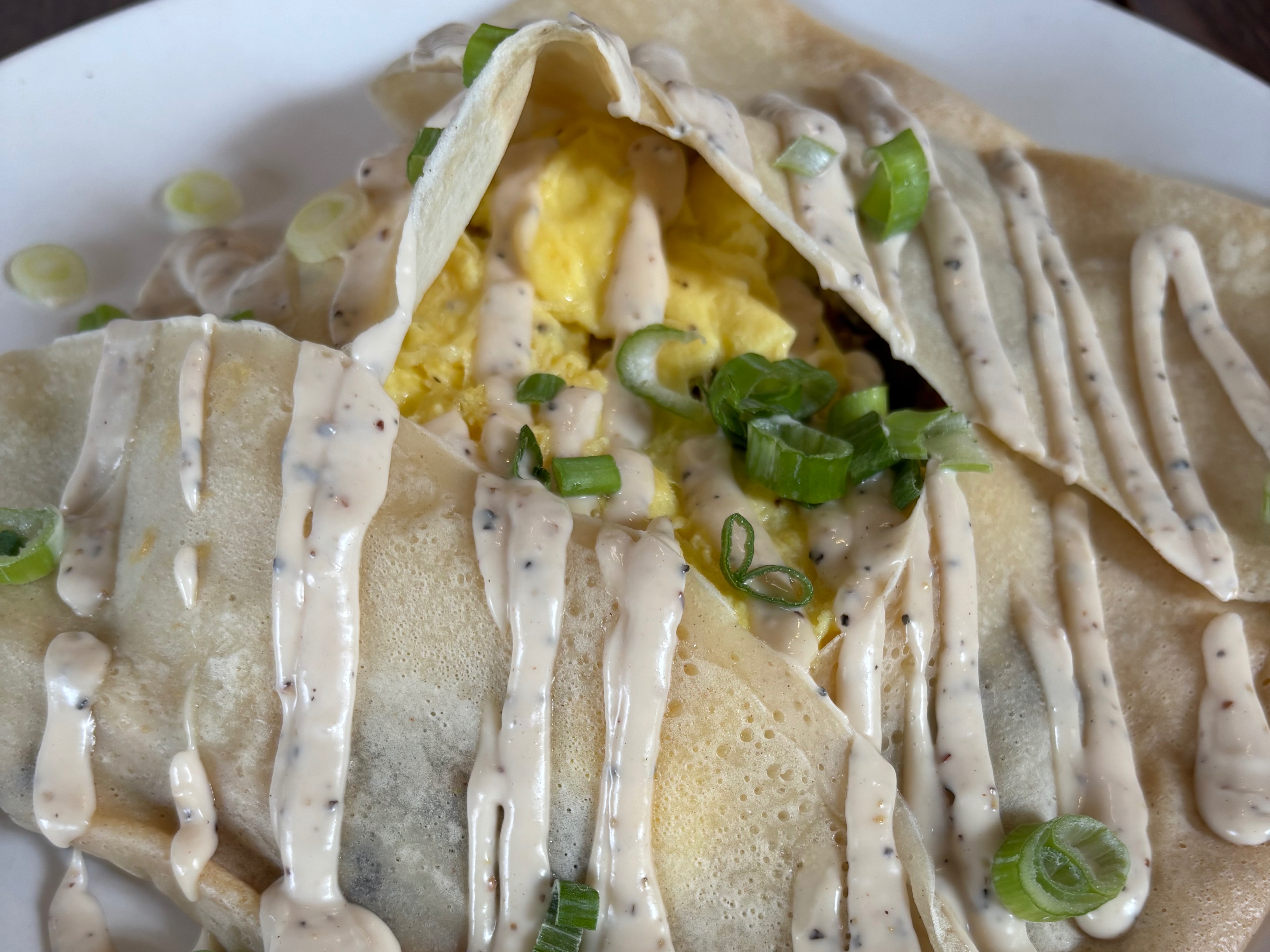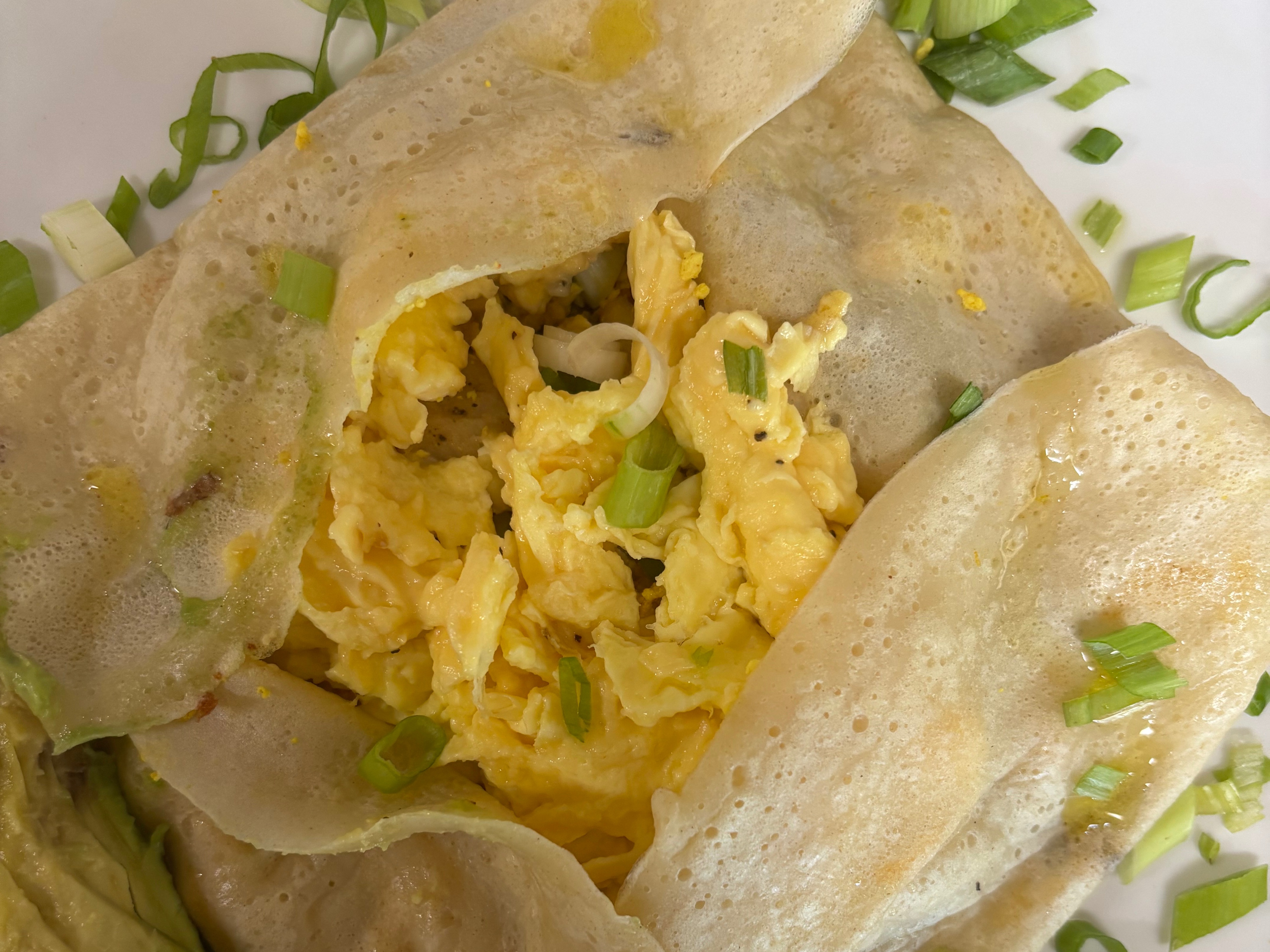 Chose Crepe, Omelette, or Scramble: Customizable egg or tofu scramble with vegan or dairy cheddar cheese.