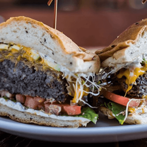 Shredded mushrooms, barley & potato patty seasoned with garlic & thyme on a toasted herb focaccia roll with rosemary aioli, caramelized onions, tomatoes, romaine, & alfalfa sprouts. Note: Burger patty contains gluten.
