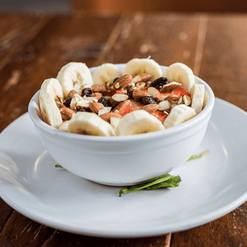 Steel cut oats made w/oat milk, chia seeds, vanilla, & brown sugar topped w/ bananas, raisins, & almonds (oats not certified GF).