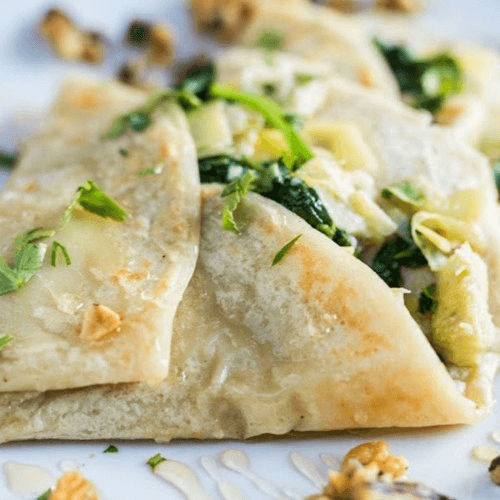 Choose crepe, omelette, or scramble: Sauteed spinach & creamy vegan garlic artichoke mix & choice of scrambled eggs or tofu scramble topped with agave, walnuts and parsley.