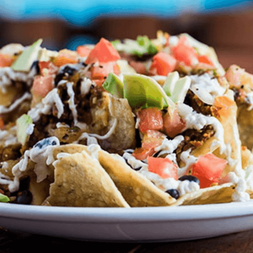 Crispy El Rey tortilla chips topped with zesty nacho cheese, seasoned black beans, chickpea chorizo, pico de gallo, cashew lime crema, & avocado.