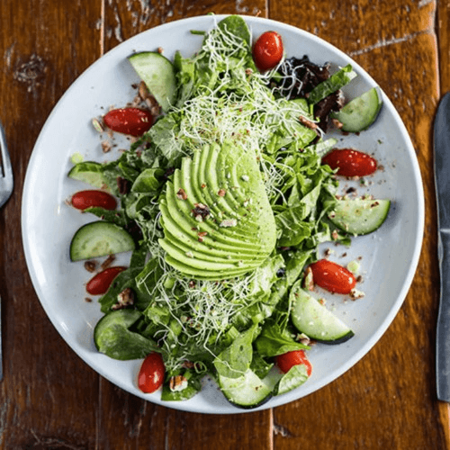 Spinach & Romaine blend with scallions, grape tomatoes, cucumbers, avocado, alfalfa sprouts & walnuts, tossed in Green Goddess dressing.