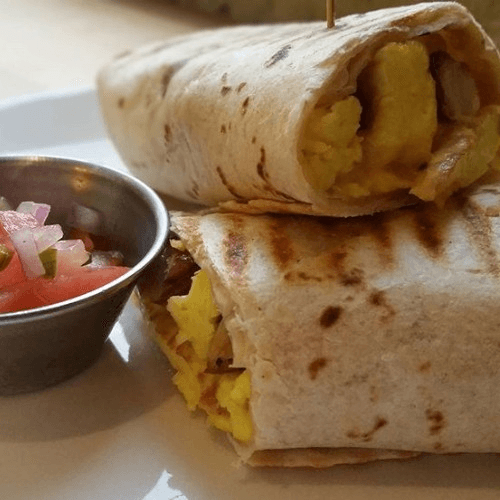 Rosemary potatoes, nacho cheese & scrambled eggs or seasoned tofu in a grilled flour tortilla, served with side of salsa.