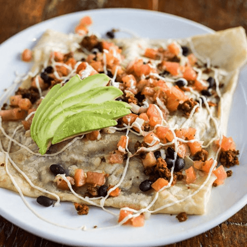 Chose Crepe, Omelette, or Scramble: Chickpea chorizo, jalapeño cheese & choice of scrambled eggs or seasoned tofu scramble, topped w/pico de gallo & cashew crema.